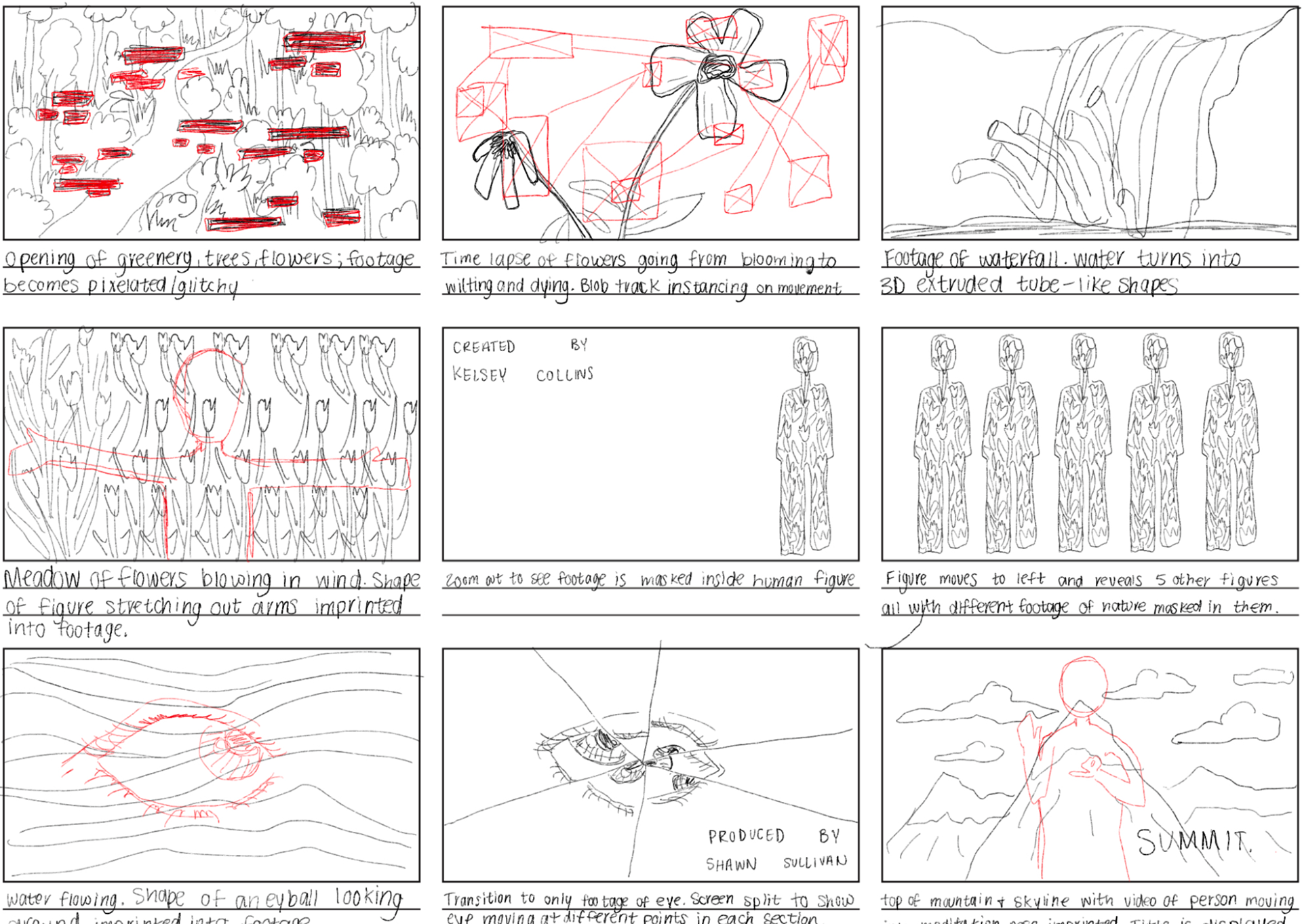 Summit is a psychological thriller film that follows a group of college graduates on their journey up a mountain in search of a higher power. The beauty of the natural world being corrupted by humans' lack of morals is visually represented through technological glitching of footage of nature scenes such as mountain ranges, forests, flower fields, and waterfalls. When paired with eerie instrumentals and harsh color correction, the title sequence is taken from serene to chaotic, reflecting the plot of the new film.